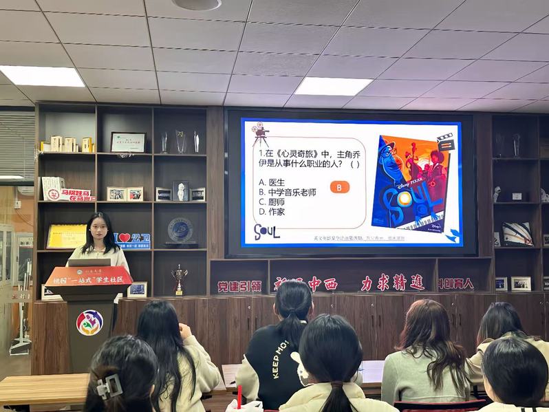活动伊始,主持人以“怎样的人生才算有意义?”引发思考,点明“当下即是最好”的核心主旨。随后,同学们沉浸式观看影片,跟随主角乔伊走进神秘的“生之来处”,在光影中感受温暖,重新审视人生意义。