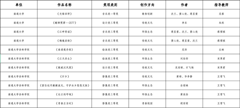 自活动开展以来,学校高度重视、积极组织参与,经学生申报、学院推荐、专家评审,推荐上报各类作品39件。最终,我校选送作品《光锥田野》获音乐类一等奖;《春溪载舟轻》、《江天共生》获绘画类三等奖;《醒狮霓雳--2077》、《数赋汉风图》获设计类三等奖;《归乡》、《留住运河粼粼波光,守护水乡悠悠文脉》、《长江的呼唤》、《青春正当时》获影像类三等奖;《江畔青谣》、《梅庵宏韵》获音乐类三等奖。